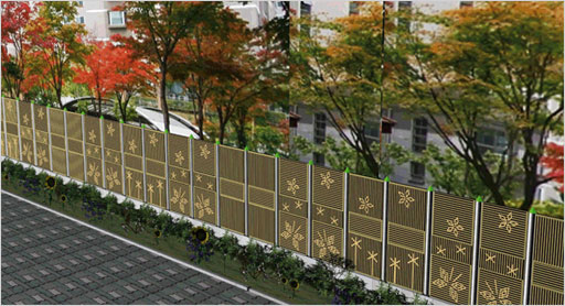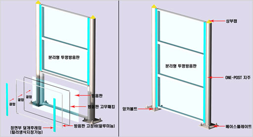 그림2는 원포스트(지주)에 분리형 방음판을 결합한 제품이며, 그림1은 방음판 파손시 별도의 장비없이 유지보수가 가능한, 탈부착식 제품으로 경제성이 우수하며, 정면부 덮개 후레임에 컬러색상을 지정가능하게 하여 한층더 외관이 미려함.